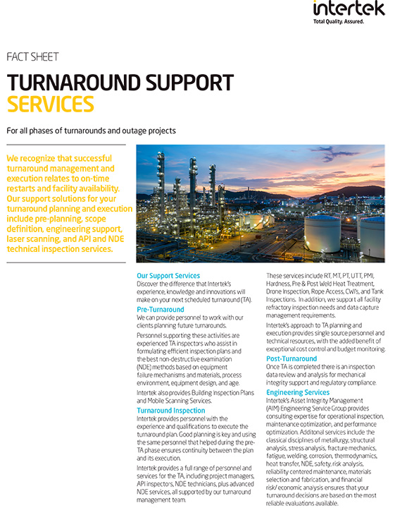 Turnarounds are scheduled and necessary events, but they are also challenging and expensive in terms of lost production time and costs associated with the required turnaround activities. Intertek's high standard of performance in turnaround work is a matter of record. Our experienced inspectors are committed to safety, and are well respected within the industry.