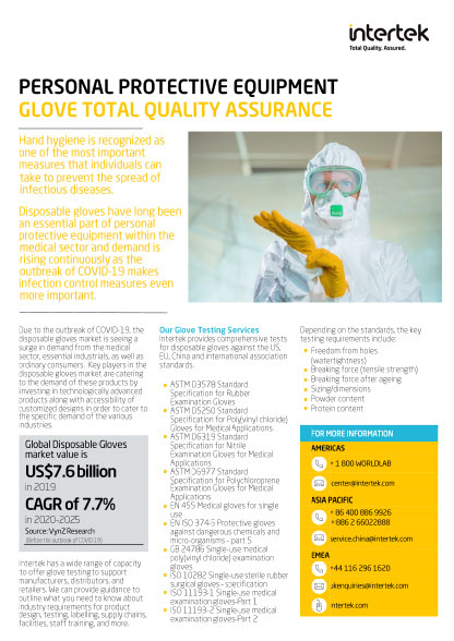 Intertek provides comprehensive tests for disposable gloves against the US, EU, China, and international association standards.